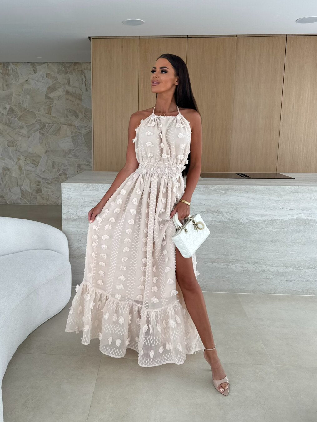 Confeccionado en tejido de poliéster ligero, este vestido destaca por su plisado delicado y el efecto patchwork, que añade profundidad visual y textura al conjunto. El escote en V resalta el cuello con gracia, mientras la abertura lateral (slit) aporta movimiento y un toque sensual sin perder sofisticación.