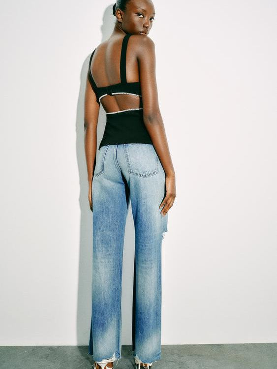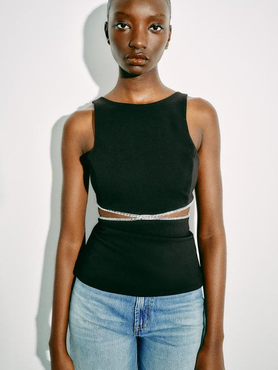 El top Rhinestone es una pieza glamourosa con detalles de pedrería y un diseño sin espalda que lo convierte en una elección impactante para ocasiones especiales. Su corte sin mangas y abertura central realzan el escote y aportan un aire sofisticado y sensual al conjunto.