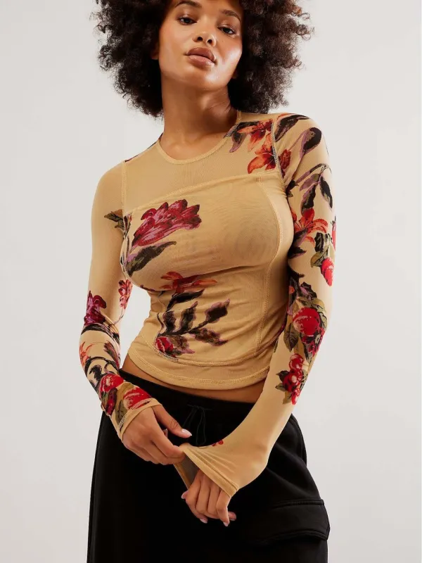 La blusa Aura combina sensualidad y elegancia a través de su delicado tejido mesh con estampado floral. Su diseño semitransparente crea un efecto visual ligero y sofisticado, perfecto para estilismos de verano con un toque especial.