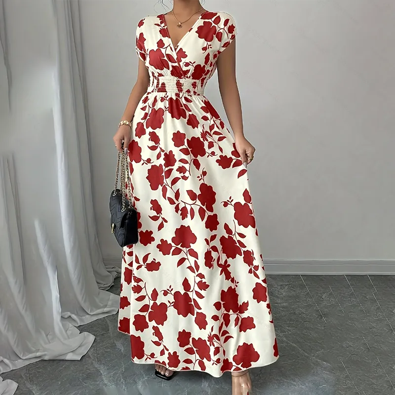 Déjate seducir por la sofisticación veraniega con este vestido maxi de estilo envolvente (wrap), con un favorecedor escote en V profundo y una cintura imperio elástica para máxima comodidad. Este vestido de manga corta combina elegancia fluida con un estilo práctico, lo que lo hace perfecto para vacaciones en la playa, fiestas en el jardín o looks casuales de fin de semana. El tejido ligero cae con gracia y la cintura elástica asegura un ajuste personalizado para cualquier tipo de cuerpo.